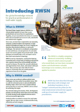 The Rural Water Supply Network (RWSN) is a leading global knowledge network on water and development. RWSN needs to be ambitious, responding to real needs at local and global levels; reaching as many rural water practitioners as possible; connecting, inspiring, and motivating; building capacity and knowledge; connecting people for joint learning and action; and supporting and amplifying the innovative and transformative work of our members. This is an invitation to all those interested in rural water supply, and connected issues, to help us shape the future of the network over the next 10 years. | »