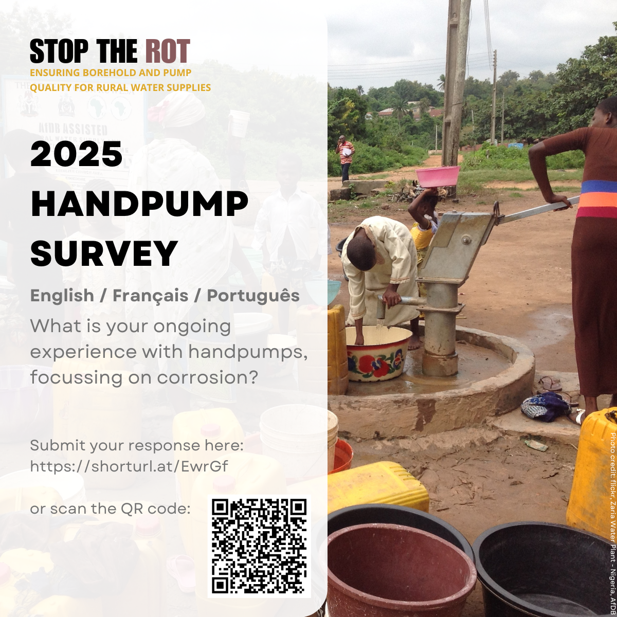 Avec cette enquête, nous souhaitons connaître vos expériences actuelles avec les pompes à motricité humaine, en mettant l'accent sur la corrosion, souvent appelée "le problème de l'eau rouge". Elle fait suite aux précédentes enquêtes sur les pompes à motricité humaine du RWSN publiées en 2013 et 2021, qui portaient sur un éventail plus large de problèmes. Des niveaux élevés de fer dans les pompes à motricité humaine peuvent nécessiter un pompage pendant un certain temps jusqu'à ce que l'eau devienne claire, peuvent entraîner le rejet de la source par les utilisateurs, et/ou peuvent conduire à une défaillance prématurée de l'approvisionnement. Nous souhaitons connaître votre avis, même si vous n'avez pas rencontré ce problème !